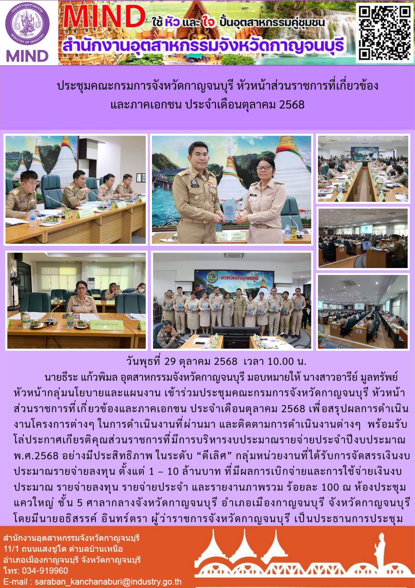 วันพุธที่ 29 ตุลาคม 2568 เวลา 10.00 น. นายธีระ แก้วพิมล อุตสาหกรรมจังหวัดกาญจนบุรี มอบหมายให้ นางสาวอารีย์ มูลทรัพย์ หัวหน้ากลุ่มนโยบายและแผนงาน เข้าร่วมประชุมคณะกรมการจังหวัดกาญจนบุรี หัวหน้าส่วนราชการที่เกี่ยวข้องและภาคเอกชน ประจำเดือนตุลาคม 2568 เพื่อสรุปผลการดำเนินงานโครงการต่างๆ ในการดำเนินงานที่ผ่านมา และติดตามการดำเนินงานต่างๆ พร้อมรับโล่ประกาศเกียรติคุณส่วนราชการที่มีการบริหารงบประมาณรายจ่ายประจำปีงบประมาณ พ.ศ.2568 อย่างมีประสิทธิภาพ ในระดับ “ดีเลิศ” กลุ่มหน่วยงานที่ได้รับการจัดสรรเงินงบประมาณรายจ่ายลงทุน ตั้งแต่ 1 – 10 ล้านบาท ที่มีผลการเบิกจ่ายและการใช้จ่ายเงินงบประมาณ รายจ่ายลงทุน รายจ่ายประจำ และรายงานภาพรวม ร้อยละ 100 ณ ห้องประชุมแควใหญ่ ชั้น 5 ศาลากลางจังหวัดกาญจนบุรี อำเภอเมืองกาญจนบุรี จังหวัดกาญจนบุรี โดยมีนายอธิสรรค์ อินทร์ตรา ผู้ว่าราชการจังหวัดกาญจนบุรี เป็นประธานการประชุม