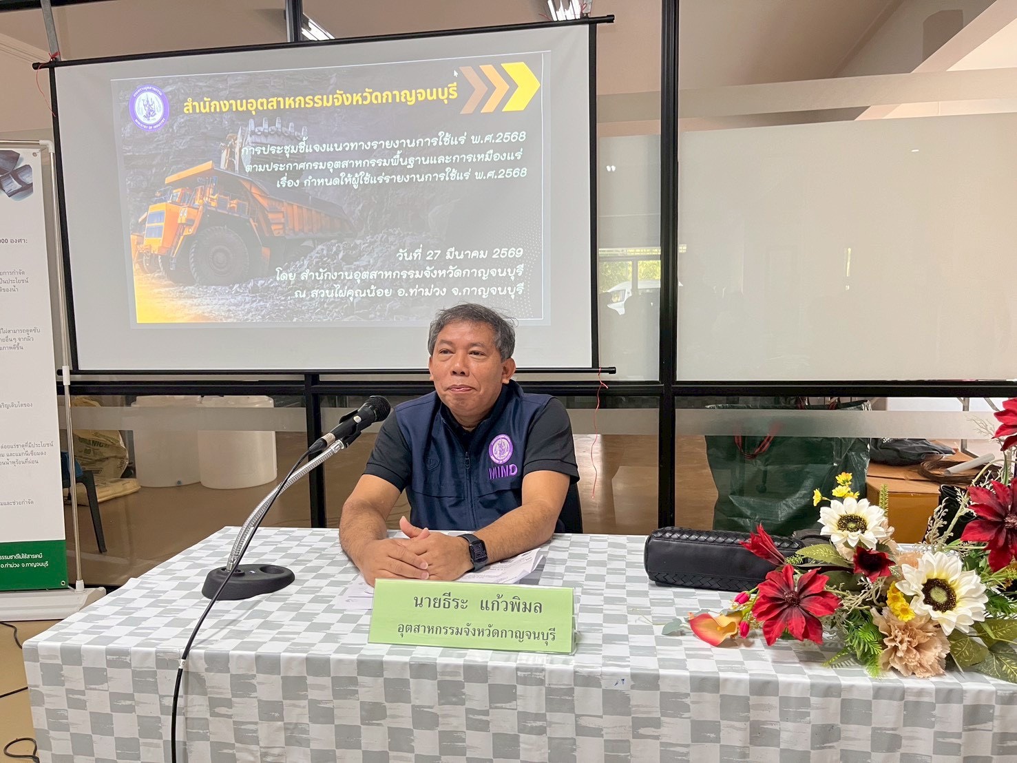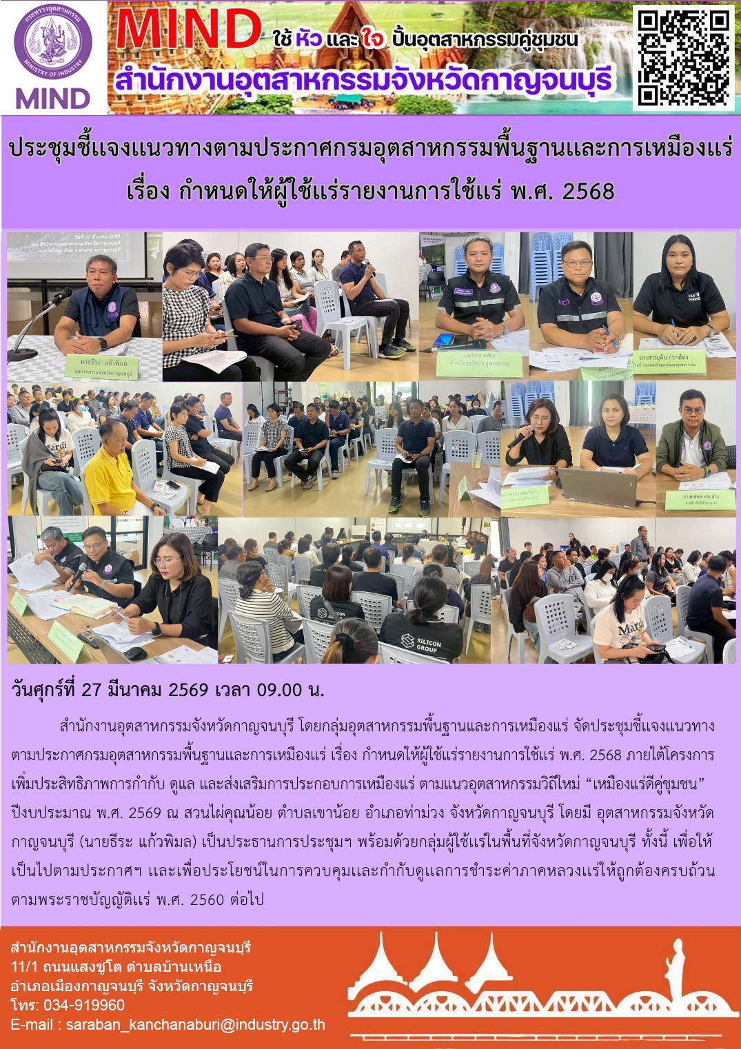 วันศุกร์ที่ 27 มีนาคม 2569 เวลา 09.00 น. สำนักงานอุตสาหกรรมจังหวัดกาญจนบุรี โดยกลุ่มอุตสาหกรรมพื้นฐานและการเหมืองแร่ จัดประชุมชี้เเจงเเนวทางตามประกาศกรมอุตสาหกรรมพื้นฐานเเละการเหมืองเเร่ เรื่อง กำหนดให้ผู้ใช้เเร่รายงานการใช้เเร่ พ.ศ. 2568 ภายใต้โครงการเพิ่มประสิทธิภาพการกำกับ ดูแล และส่งเสริมการประกอบการเหมืองแร่ ตามแนวอุตสาหกรรมวิถีใหม่ “เหมืองแร่ดีคู่ชุมชน”ปีงบประมาณ พ.ศ. 2569 ณ สวนไผ่คุณน้อย ตำบลเขาน้อย อำเภอท่าม่วง จังหวัดกาญจนบุรี โดยมี อุตสาหกรรมจังหวัดกาญจนบุรี (นายธีระ แก้วพิมล) เป็นประธานการประชุมฯ พร้อมด้วยกลุ่มผู้ใช้เเร่ในพื้นที่จังหวัดกาญจนบุรี ทั้งนี้ เพื่อให้เป็นไปตามประกาศฯ เเละเพื่อประโยชน์ในการควบคุมเเละกำกับดูเเลการชำระค่าภาคหลวงเเร่ให้ถูกต้องครบถ้วนตามพระราชบัญญัติเเร่ พ.ศ. 2560 ต่อไป